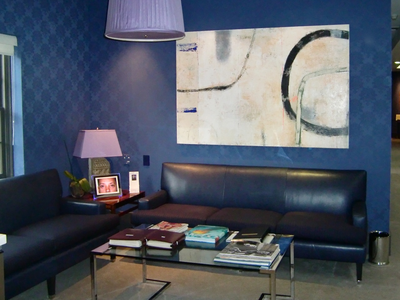 A large abstract acrylic on canvas painting by Michael Moon adds interest to the reception room of this medical office.